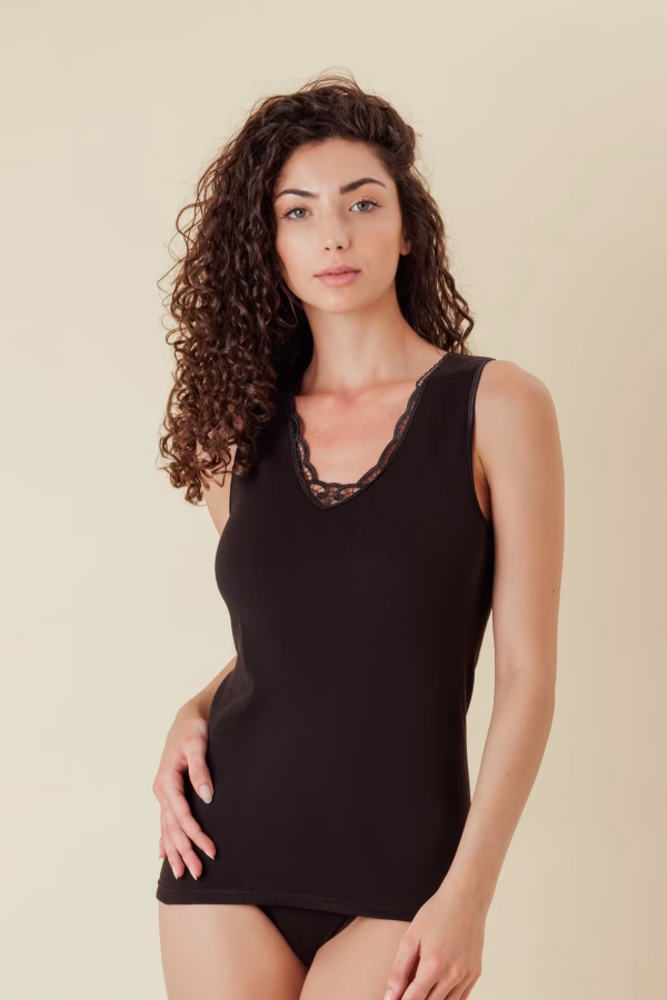 Canotta Intima Donna Spalla Larga Pizzo 100% Jersey Caldo Cotone Bianco e Nero