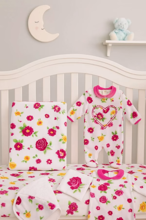 Corredino Prima Nascita Neonato – Set 11 Pezzi in Ciniglia Fantasia Rose