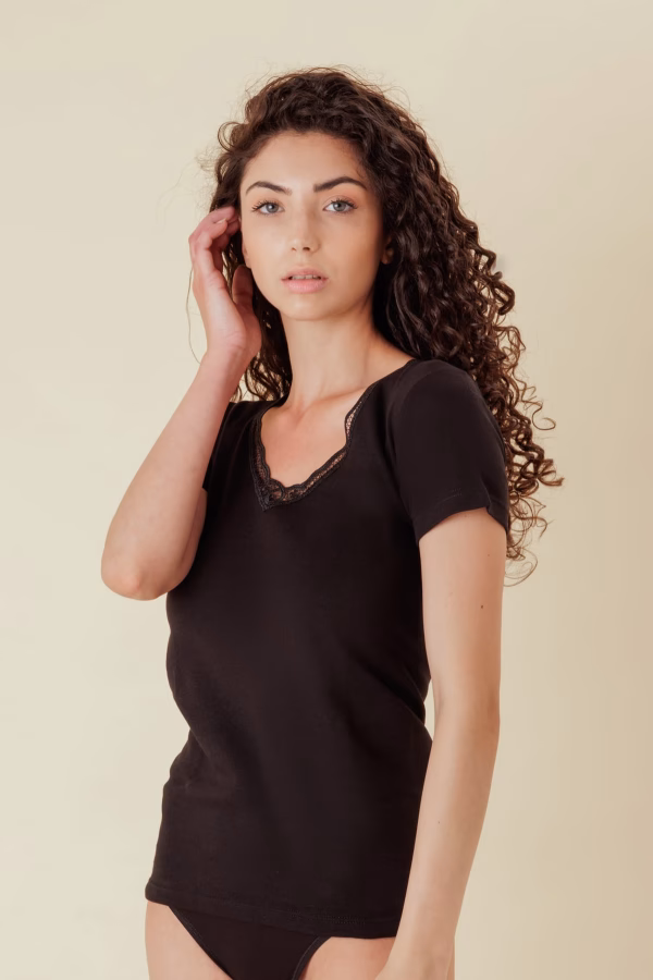 Maglia Intima Donna Mezza Manica Pizzo 100% Jersey Caldo Cotone Bianco e Nero
