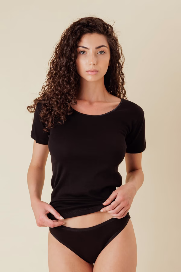 Maglia Intima Donna Mezza Manica Raso 100% Cotone Jersey Costina 1 in 1 Bianco e Nero
